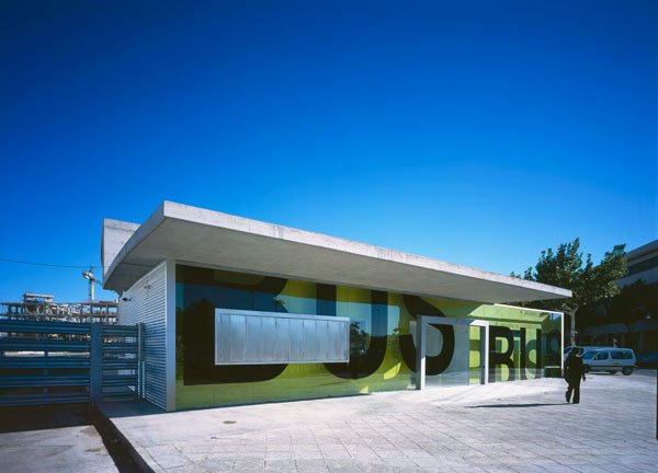 A funnel entrance of low height drives us to the hall. Then, the platforms. Here a glass box envelopes us and shows the complete perspective of the shelter, where the numbers drawn on the pillars make us realize its scale. An umbrella of road safety barrier slides down the slab along the route marked by the orientation of the sun. The same metallic piece is used as a protection element in the doors for vehicle access.